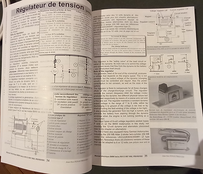 étude technique et pratique des équipements électriques des motos BMW de la R51/3 à la R69/S détaillant les génératrices (Dynamos 6 V et 12 volts, alternateur) démontages rotors stators, régulateurs: réglages régulateurs et ponts redresseurs, l'allumage par magnéto démontage réglages, le circuit électrique, batterie, plaquette de phare, schémas électriques (6 versions) etc.